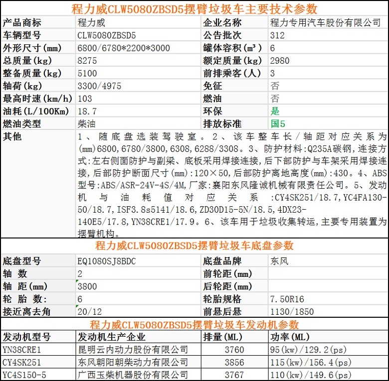 采用東風(fēng)原裝底盤,EQ1110SJ8BDC 國五 多利卡D7,脂玉白,軸距3800,2030單排前翻轉(zhuǎn)駕駛室,發(fā)動機(jī)國五朝柴 CY4SK251,156馬力;一汽錫柴4DX23-140E5,140馬力,變速箱6A120(6TS55)萬里揚(yáng)6擋變速箱,前后橋2.2/4.2T(2.5/5.5T配8.25R16),192mm寬的變截式大梁,板簧8/10+7,輪胎8.25R16鋼絲胎、方向助力、斷氣剎、電動車窗、中控鎖、ABS、帶原廠空調(diào)。
