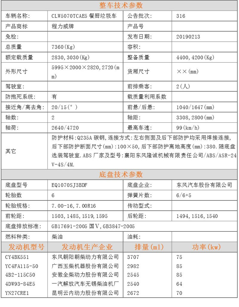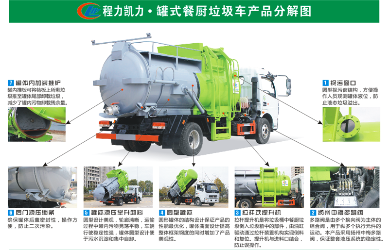 餐廚垃圾車,又稱餐余垃圾車、余廚垃圾車或者泔水車,是用于收集和運輸生活垃圾、食品垃圾(泔水)及城市淤泥的專用車輛,改裝部分具有裝、卸垃圾自動化程度高、工作可靠、密封性好、裝載容積大、操作簡便、作業(yè)過程密閉,無污水泄露和異味的散發(fā),環(huán)保性好等特點?膳溲b載不同規(guī)格的標準垃圾桶,具有廣泛的適用性。