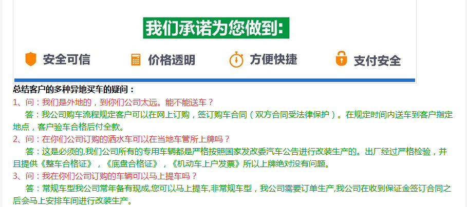 | 2、購車流程: | 1、咨詢洽談(電話洽談或來廠考察洽談) 2、簽訂汽車購銷合同(傳真、郵遞或者來廠簽訂) 3、我廠按時按質(zhì)生產(chǎn) 4、交付驗收 >>點擊查看詳細(xì)內(nèi)容 |
