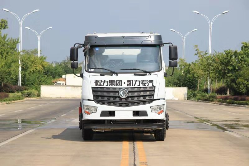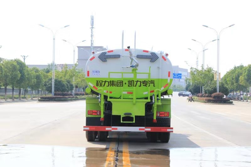 前噴后灑,前裝有鴨形噴嘴或圓頭沖嘴,后面裝有圓柱開灑水噴嘴或蓮蓬頭噴嘴,后部有一工作平臺,裝配有高壓水炮。后部還可裝8個噴嘴(選裝)噴水器一般用于沖洗街道。