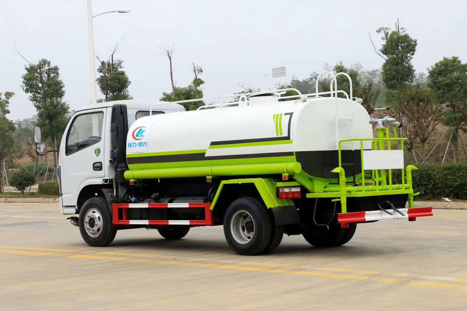 由發(fā)動機(jī)帶動變速箱,變速箱上安裝的取力器帶動灑水泵,灑水泵產(chǎn)生主要動力,將罐體內(nèi)部的液體通過管網(wǎng)噴灑出去。自吸高度:≤7m,灑水寬度:≥20m,最大射程:≥28m;可調(diào)節(jié)成柱狀,射程≥28m;也可調(diào)節(jié)成霧狀,射程≥5m。 前噴后灑,前裝有鴨形噴嘴或圓頭沖嘴,后面裝有圓柱開灑水噴嘴或蓮蓬頭噴嘴,后部有一工作平臺,裝配有高壓水炮。后部還可裝8個(gè)噴嘴(選裝)噴水器一般用于沖洗街道。