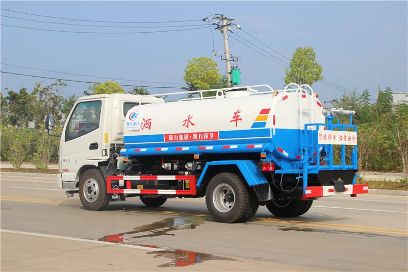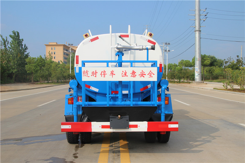 前噴后灑,前裝有鴨形噴嘴或圓頭沖嘴,后面裝有圓柱開灑水噴嘴或蓮蓬頭噴嘴,后部有一工作平臺,裝配有高壓水炮。后部還可裝8個噴嘴(選裝)噴水器一般用于沖洗街道